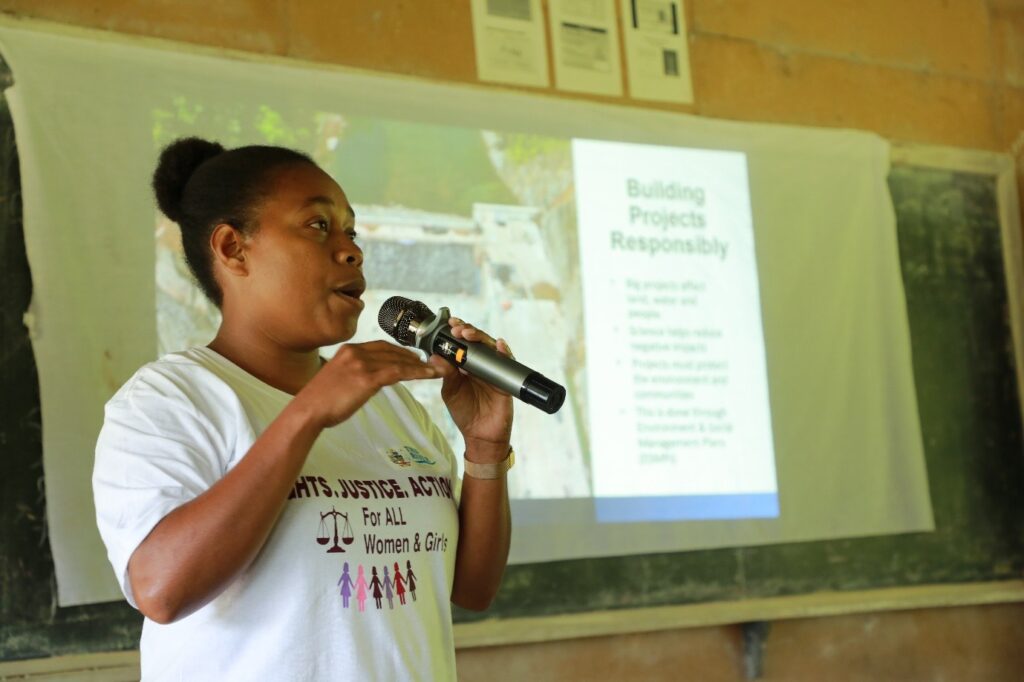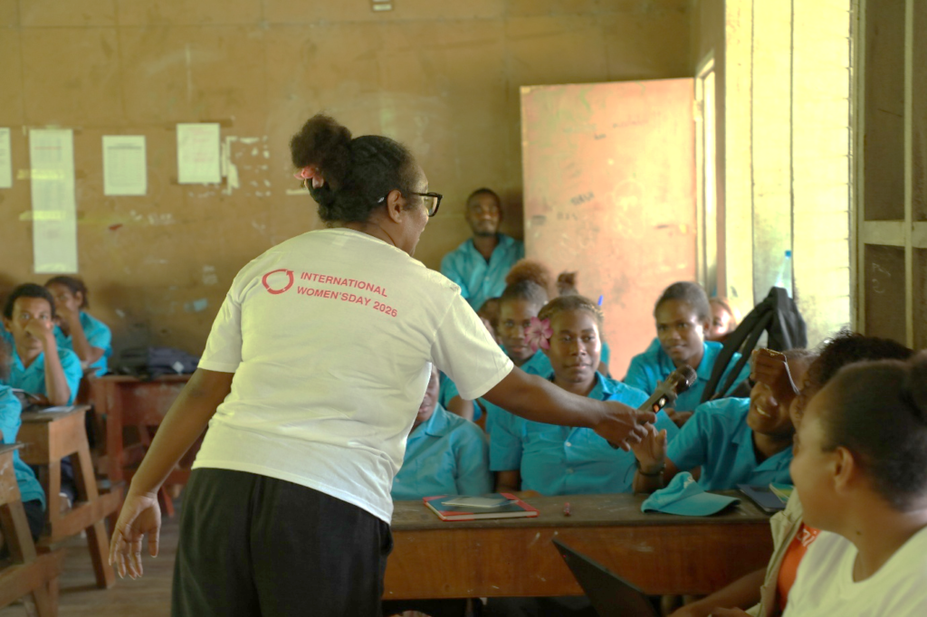 Fig. 3: Ivory Solomate, Environment and Social Officer with Hyundai Engineering Company (HEC), speaks to students about her role in the Tina River Hydropower Development Project during the International Women’s Day programme at Betivatu Community High School.